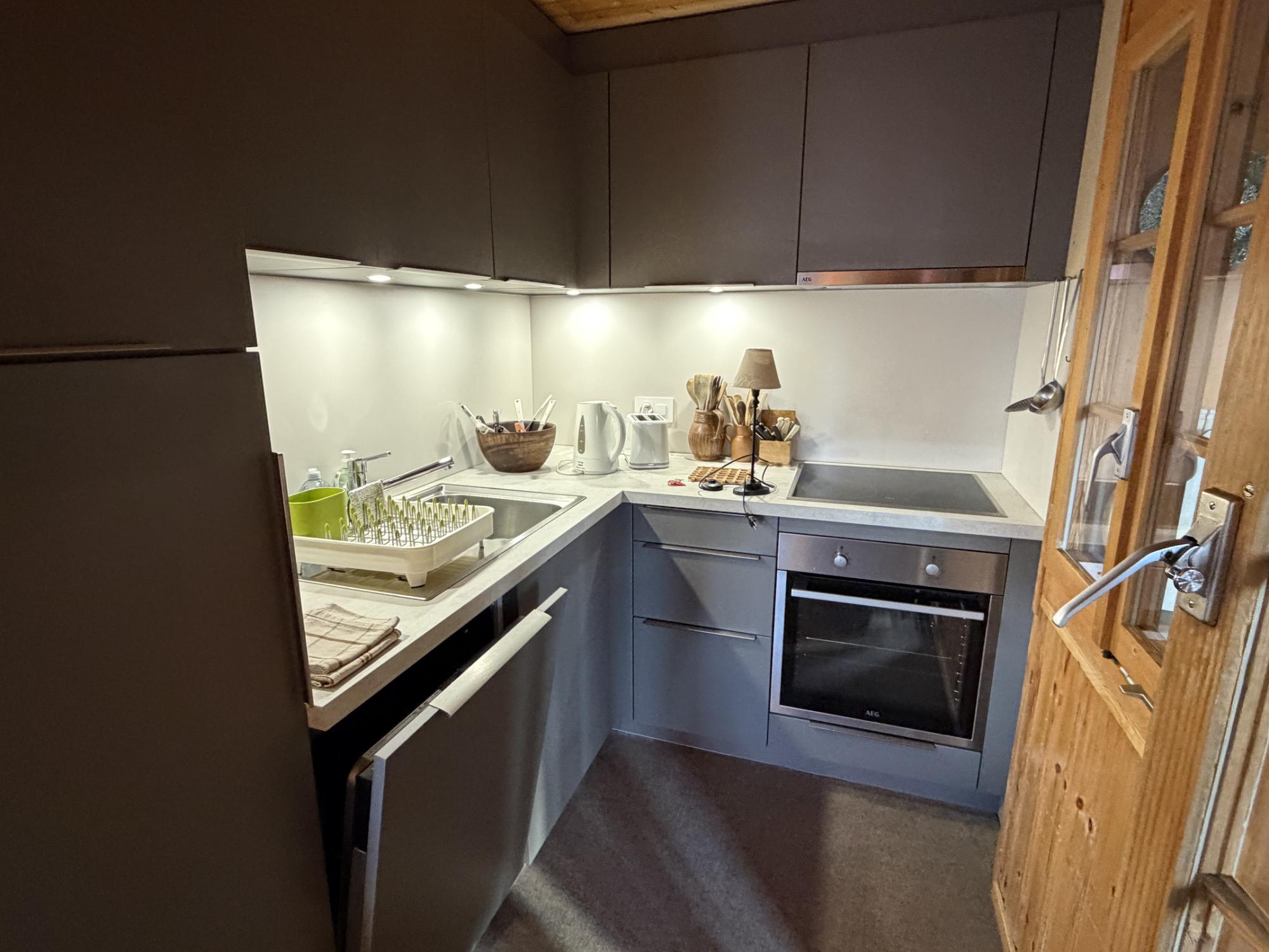 L’étage inférieur, accessible uniquement par l’extérieur, dispose d’une chambre double (deux lits simples côte à côte) avec salle de douche privative. Ce niveau indépendant comprend également une petite cuisine équipée avec machine à café et coin détente.